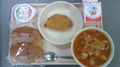 ロールパン 牛乳 ほきのバジル揚げ ミネストローネ 豆乳パンナコッタ(みかん)
