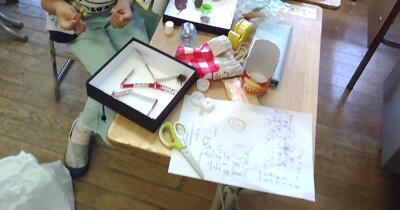 家から持って来た紙コップと毛糸を使ってけん玉を作っています。