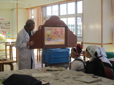 初めに新井武平商店様から味噌つくりの工程の紙芝居やお話をしていただきました。