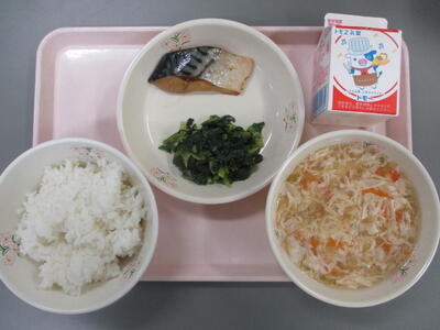 ごはん 牛乳 さばの幽庵焼き かきたま汁 小松菜の炒め物
