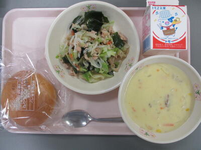 米粉入りシュガーパン 牛乳 コーンシチュー 切り干し大根のサラダ