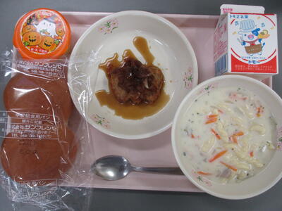 子供パン 牛乳 ハンバーグステーキ マカロニのクリームスープ パンプキンババロア