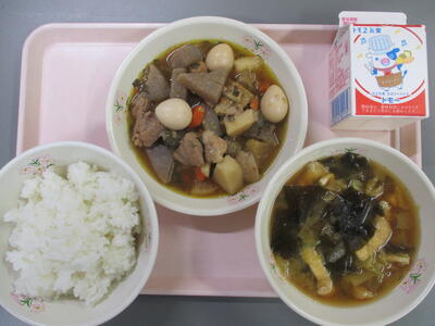 12月3日(水) 投稿: 青木中央小学校 (12:49) ごはん 牛乳 豚肉とうずらの卵のうま煮 白菜のみそ汁 今日は「白菜のみそ汁」に使われている「白菜」について紹介します。 もともと中国で改良された野菜で、寒さに強いかぶと、青梗菜の仲間から作られました。 白菜は1年中作られていますが、寒い季節の方が甘みは強く、おいしくなります。 今日もおいしくいただきます。