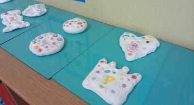 【2年生】図工 まごころメダル 投稿: 青木中央小学校 (12/15) 図工の学習で「まごころメダル」を作りました。 だれに、どのような気持ちを伝えたいのか考えました。 形を考え、型押し、飾りつけなど、贈りたい相手のことを考えながら、気持ちを込めて作っていました。 今週は、絵の具で色を塗っていきます。 どのようなまごころメダルになるのか、楽しみですね。